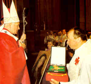 a biały orzeł z napisem ,,Da pacem Domine diebus nostris (,,Daj Panie