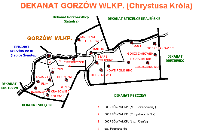 | 1. Babimost 2. Drezdenko 3. Głogów (św. Mikołaja) 4. Głogów (NMP Królowej Polski) 5. Gorzów Wlkp. (Chrystusa Króla) 6. Gorzów Wlkp. (Katedra) 7. Gorzów Wlkp. (Trójcy Świętej) 8. Gubin 9. Kostrzyn | 10. Kożuchów 11. Krosno Odrz. 12. Lubsko 13. Łęknica 14. Nowa Sól 15. Pszczew 16. Rzepin 17. Sława 18. Strzelce Krajeńskie | 19. Sulechów 20. Sulęcin 21. Szprotawa 22. Świebodzin 23. Wschowa 24. Zielona Góra (św. Jadwigi) 25. Zielona Góra (Narodzenia NMP) 26. Żagań 27. Żary |
