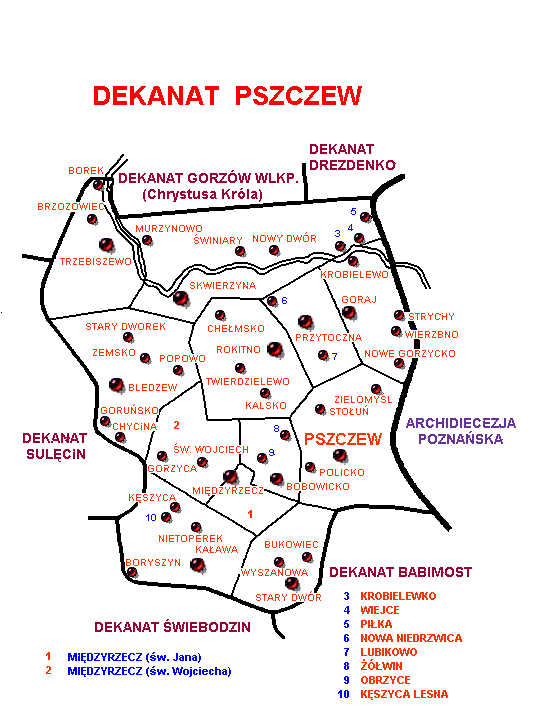 dziekan: ks. inf kan. Henryk Guzowski PARAFIE: Bledzew p.w. św. Katarzyny data erekcji: 1640 r. Bobowicko p.w. Miłosierdzia Bożego data erekcji: 1987 r. Goraj p.w. Trójcy Świętej data erekcji: 1619 r. Kaława p.w. św. Mikołaja data erekcji: 1510 r. Międzyrzecz p.w. św. Jana Chrzciciela data erekcji: 1232 Międzyrzecz p.w. św. Wojciecha data erekcji: 1980 r. Przytoczna p.w. Trojcy Świetej data erekcji: 1755 r. Pszczew p.w. św. Marii Magdaleny data erekcji: 1250 r. Rokitno p.w. Matki Bożej Rokitniańskiej data erekcji: 1335 r. Skwierzyna p.w. św. Mikołaja Biskupa data erekcji: XIII w. Stary Dwór p.w. św. Wawrzyńca data erekcji: 1933 r. Trzebiszewo p.w. św. Jana Nepomucena data erekcji: 1670 r. |